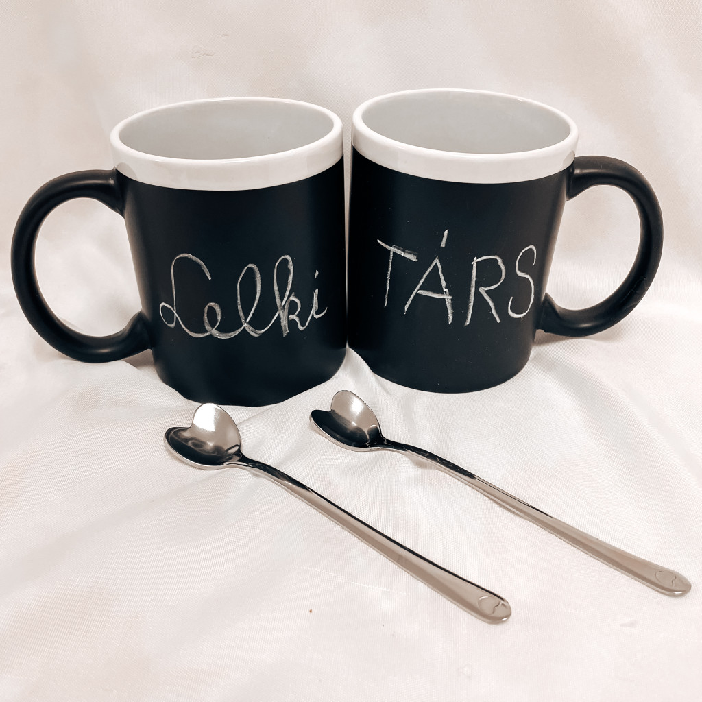 A bögre felületére krétával lehet írni vagy rajzolni. Egy szívecskés kiskanalat és egy fehér krétát is adunk hozzá.